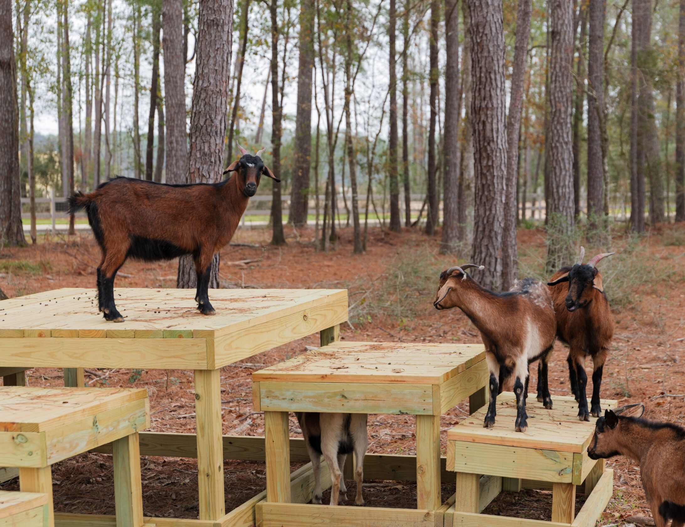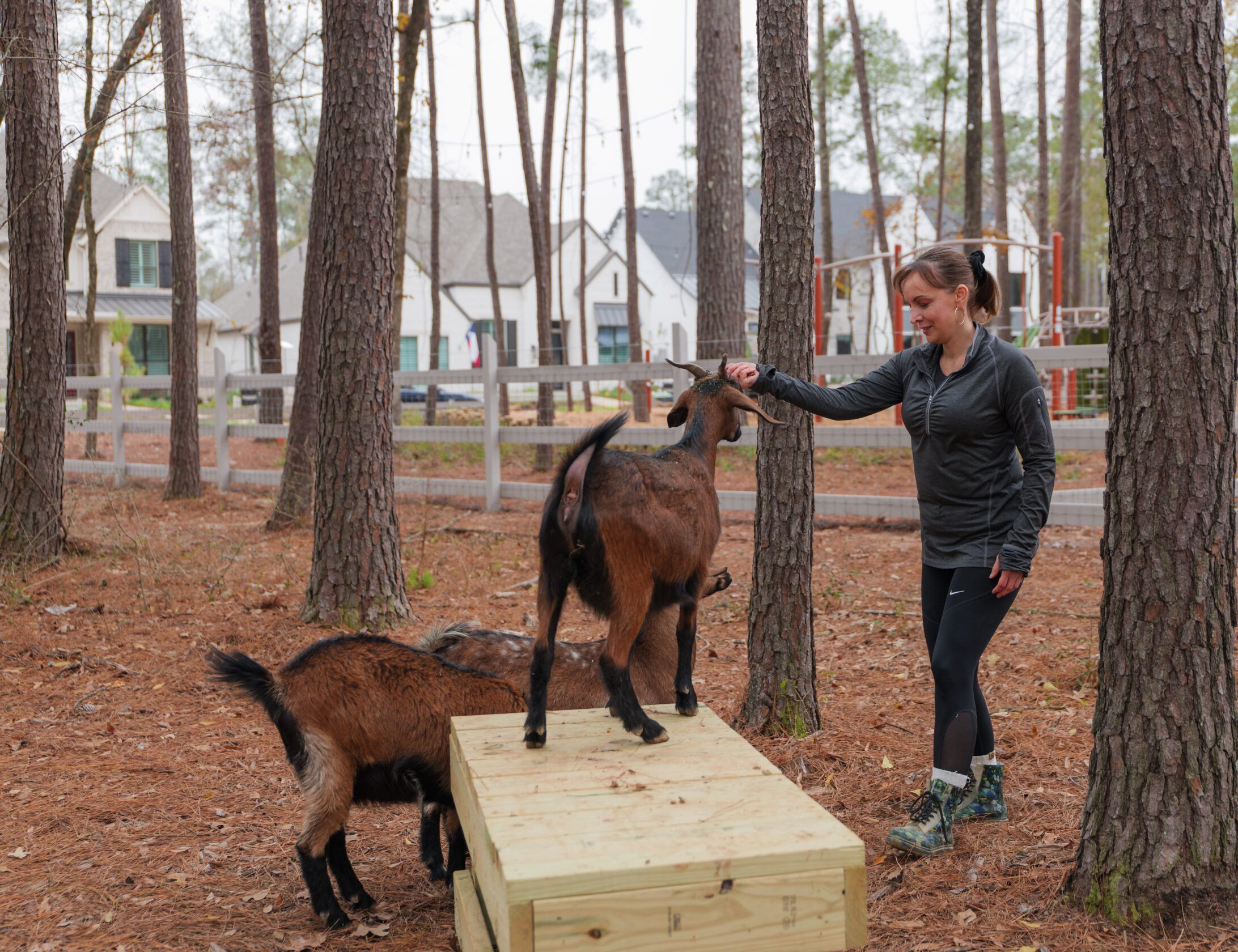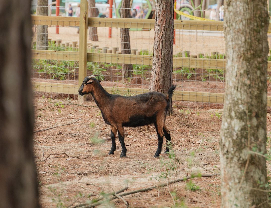 Our Nubian and Spanish goats are pros at jumpin’, bleatin’ and eatin’, with the occasional side gig of helping clear brush around the community. Farmer James and Farmer Madi, our dedicated on-site farmers and goat wranglers, will be here caring for the herd and hosting resident-only workshops and volunteer days year-round.